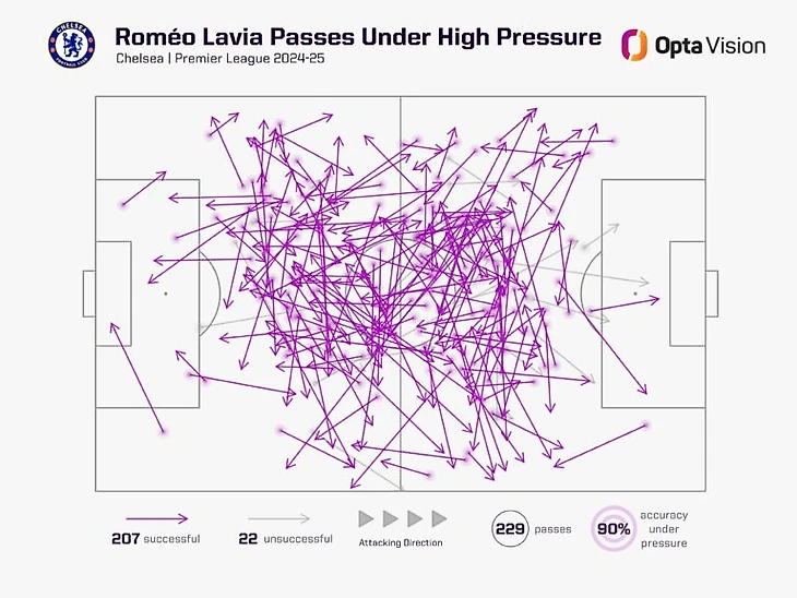 Уникальность Лавиа - в редком сочетании качеств, заставляющих специалистов видеть в нём будущего лидера опорной зоны. С одной стороны, он демонстрирует впечатляющую физическую мощь - его показатель успешности в наземных единоборствах (57.1%) в сезоне 2022/23 вывел его в топ-8 центральных полузащитников АПЛ. С другой - обладает неожиданной для игрока его амплуа технической оснащённостью, о чём говорит лучший в «Челси» процент успешных дриблингов (66.7%) среди игроков с достаточным игровым временем.