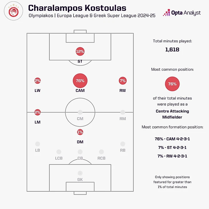 Костулас пробился в основной состав «Олимпиакоса» в прошлом году после впечатляющих выступлений на позиции центрфорварда в молодёжных командах. Однако в первой команде он чаще играл чуть глубже, под нападающим, а также пробовал себя на разных позициях по всему полю, что видно на приведённой схеме.
