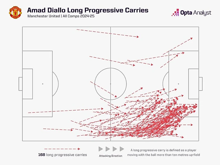 5.5 прогрессивных продвижений с мячом (на 10+ метров к воротам) — лучший показатель в «Юнайтед»