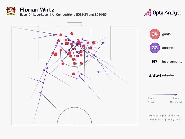 Хотя в сезоне 2024/25 ни он, ни «Байер» не повторили этот успех, его статистика (16+14) всё равно впечатляет. 12 ассистов с игры — больше только у Салаха (18) и Ямаля (13) в топ-5 чемпионатах.