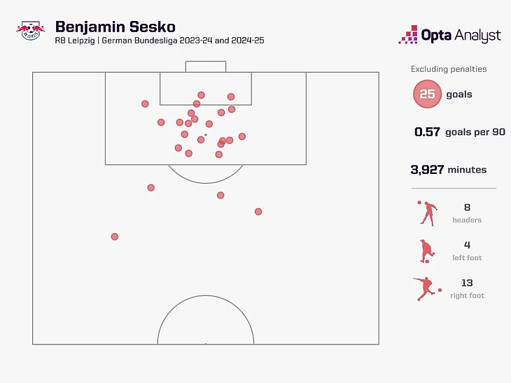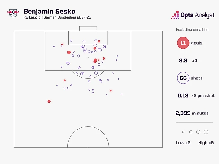 Также Шешко стал реже бить по воротам из штрафной (с 2,4 ударов за 90 минут в предыдущем сезоне до 1,5 в 2024/25) и забил значительно меньше голов с близкой дистанции. Среди 12 игроков, забивших 12+ голов в Бундеслиге в сезоне 2024/25, только вингер «Баварии» Майкл Олисе (66,7%) забил меньший процент голов из штрафной, чем Шешко (76,9%). В этой же группе Шешко демонстрирует самый низкий процент ударов из штрафной площади — всего 63,2%.