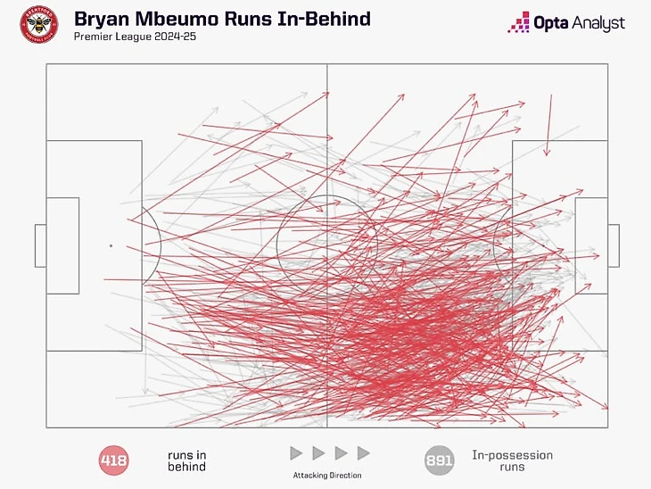 Брайан Мбемо из «Брентфорда» — универсал, чьи перемещения идеально дополнят склонность Шешко оттягиваться вглубь. В сезоне-2024/25 он лидировал в АПЛ по забегам за спину защитникам (418).
