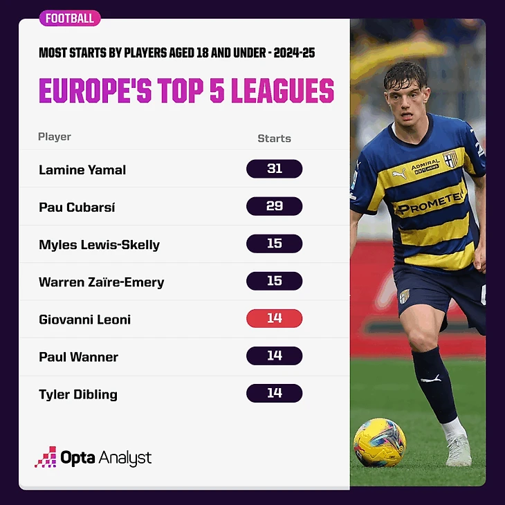 Если же рассматривать всех игроков 18 лет и младше, то лишь четверо футболистов в топ-5 лигах Европы выходили в стартовом составе чаще, чем Леони (14 матчей в основе).
