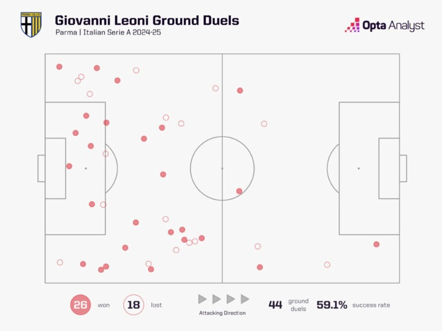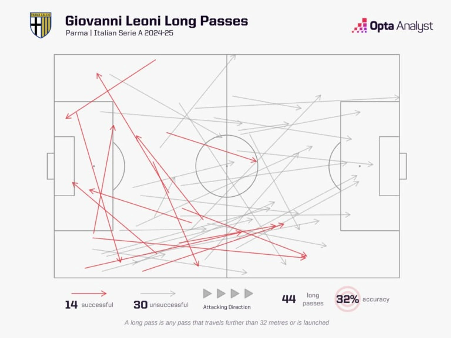 Точность передач у итальянца на достойном уровне — 88,7% успешных пасов в «Парме». Этот показатель особенно впечатляет, учитывая, что команда занимала четвертое место с конца по владению мячом в Серии А (всего 44,4%). Леони редко получал мяч, но в большинстве случаев распоряжался им уверенно.