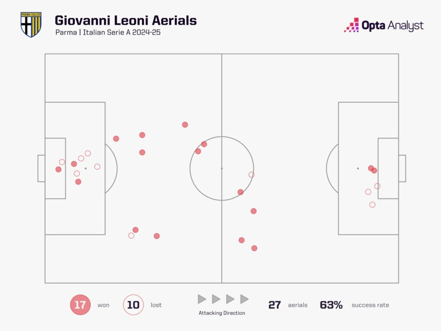 При росте 196 см Леони уже обладает идеальными физическими данными для центрального защитника. Неудивительно, что он преуспевает в верховых единоборствах: в прошлом сезоне в Серии А он выиграл 63% верховых единоборств, а его 17 победных единоборств в воздухе стали лучшим показателем среди всех футболистов 18 лет и младше в чемпионате Италии.