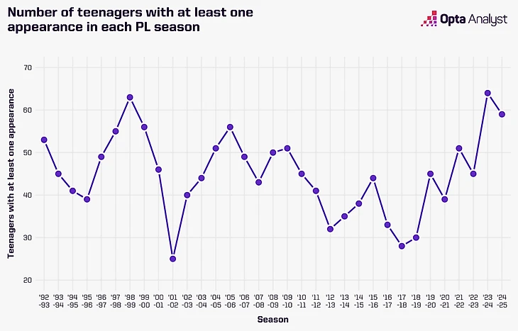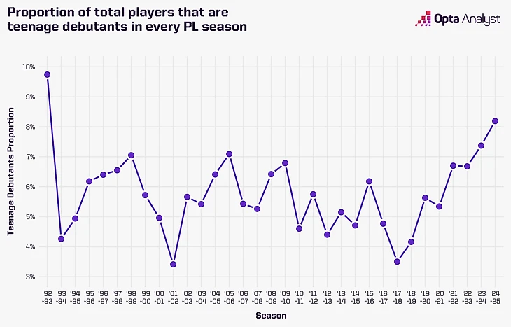 В сезоне 1992/93 в Премьер-лиге дебютировали 53 подростка, но особый статус того периода подчёркивает тот факт, что этот показатель не превышал 38 человек вплоть до сезона 2023/24 (42 дебютанта).