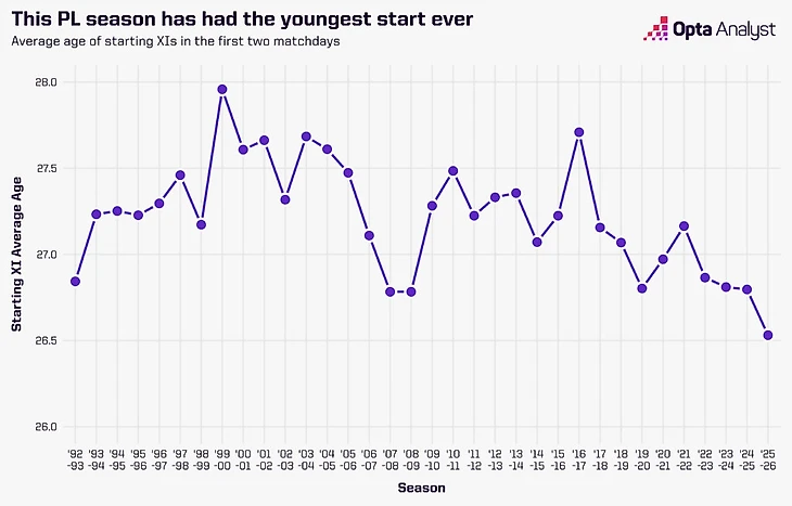 Это сравнение показывает, что средний возраст стартовых составов команд Премьер-лиги в сезоне 2025/26 оказался ниже, чем в первые два тура любого другого сезона за всю историю турнира.