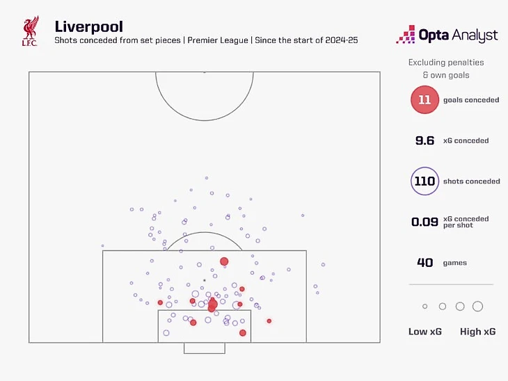 Тем не менее, стоит отметить, что только у «Арсенала» (88) и «Манчестер Сити» (87) было меньше моментов, созданных соперниками со стандартных положений, чем у «Ливерпуля» (110) за этот период. Кроме того, только у трёх команд показатель ожидаемых голов (xG) против со стандартов был ниже ливерпульского (9.6). Это позволяет предположить, что проблема может заключаться скорее в статистической случайности и локальном невезении, чем в системных недостатках игры против стандартов.