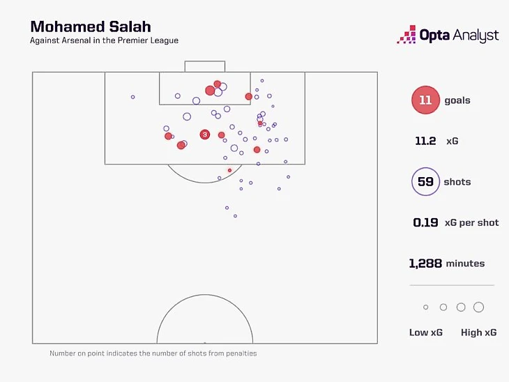Салах забил 11 голов в Премьер-лиге против «Арсенала». Только Харри Кейн (14) и Уэйн Руни (12) забивали чаще «канонирам». Эти 11 голов распределены по 10 разным матчам — только Кейн (12) забивал в большем количестве отдельных матчей против «Арсенала» в Премьер-лиге, чем Салах.