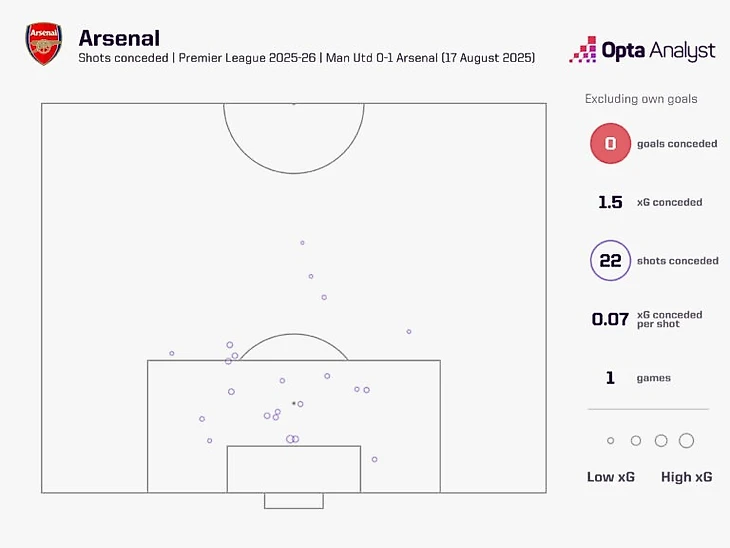 Однако в стартовом матче сезона против «Манчестер Юнайтед» «Арсеналу» повезло сохранить ворота «сухими». Несмотря на победу 1:0, «Юнайтед» совершили 22 удара — в последний раз больше ударов «Арсенал» допускал в матче лиги без удаления игрока в августе 2021 года против «Манчестер Сити» (25 ударов). Это также стало матчем с наибольшим количеством ударов по их воротам без пропущенных голов с ноября 2020 года против «Лидса» (25 ударов).