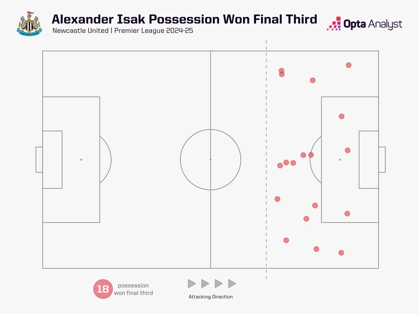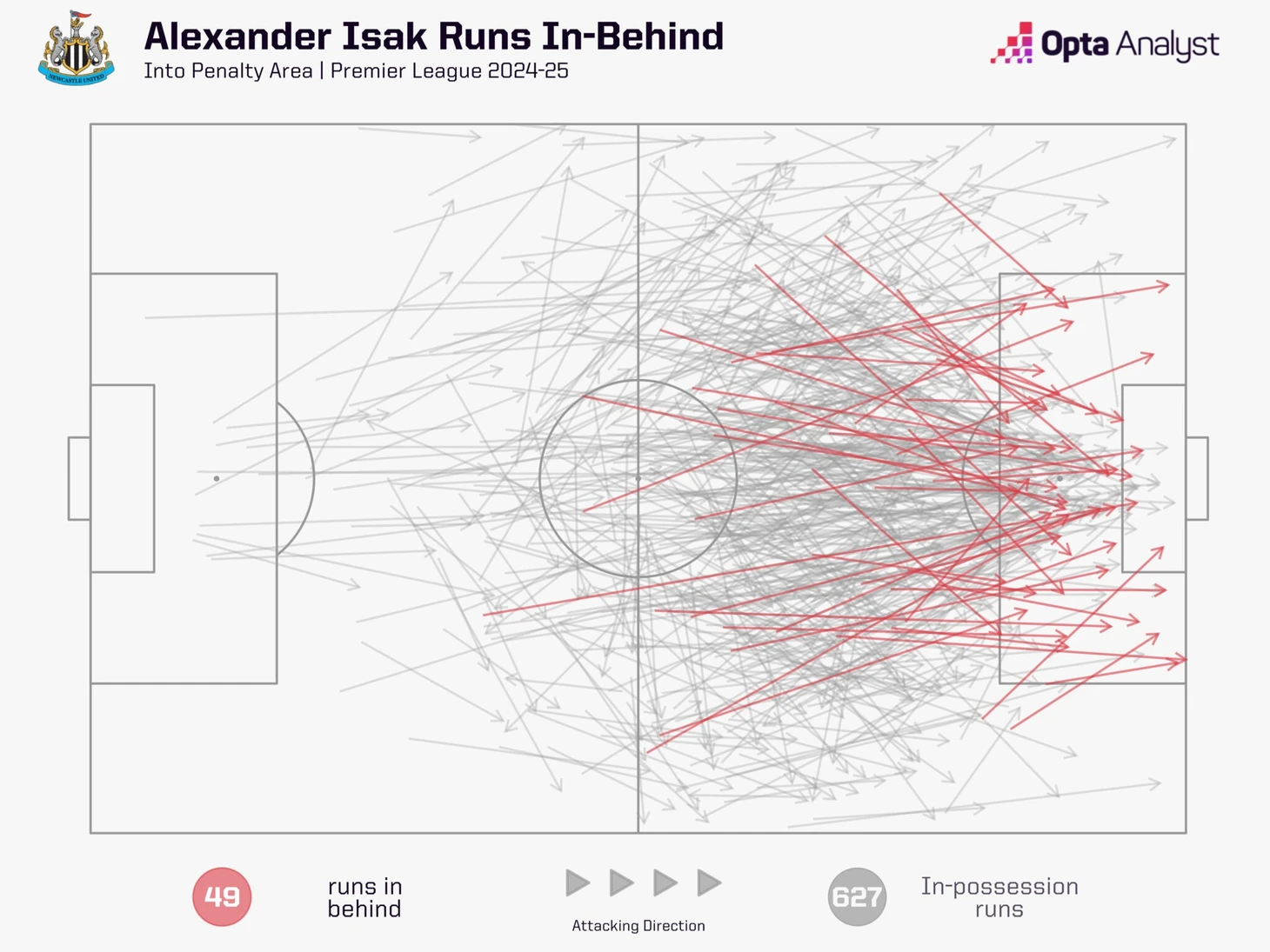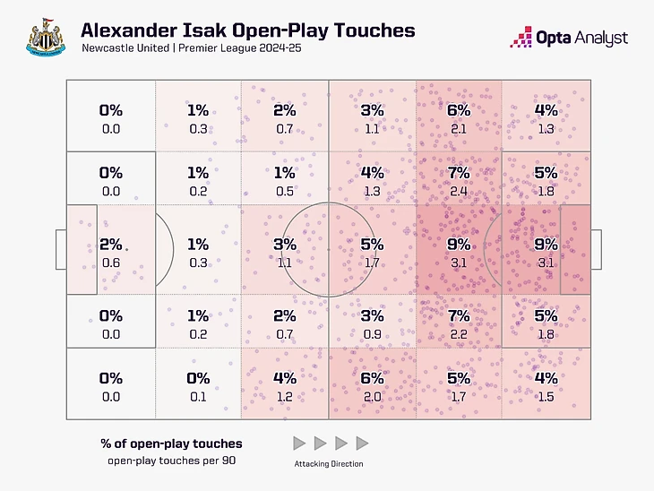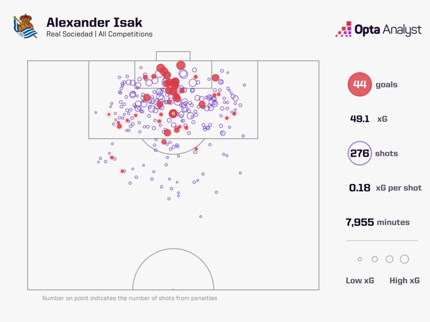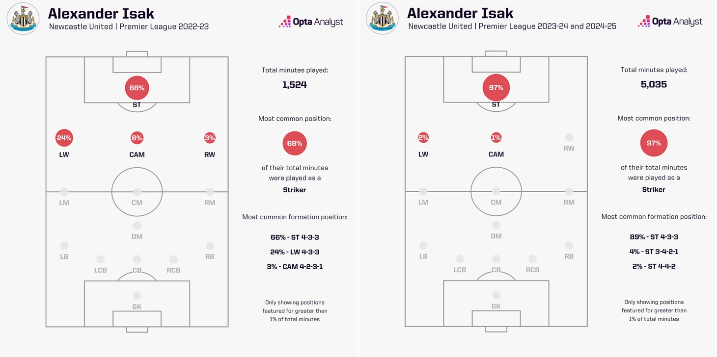 Следует подчеркнуть, что Исак — именно центральный нападающий. В своем первом сезоне в «Ньюкасле» около 24% своего игрового времени в Премьер-лиге он действительно провел на левом фланге, однако с тех пор он почти исключительно играет по центру.
