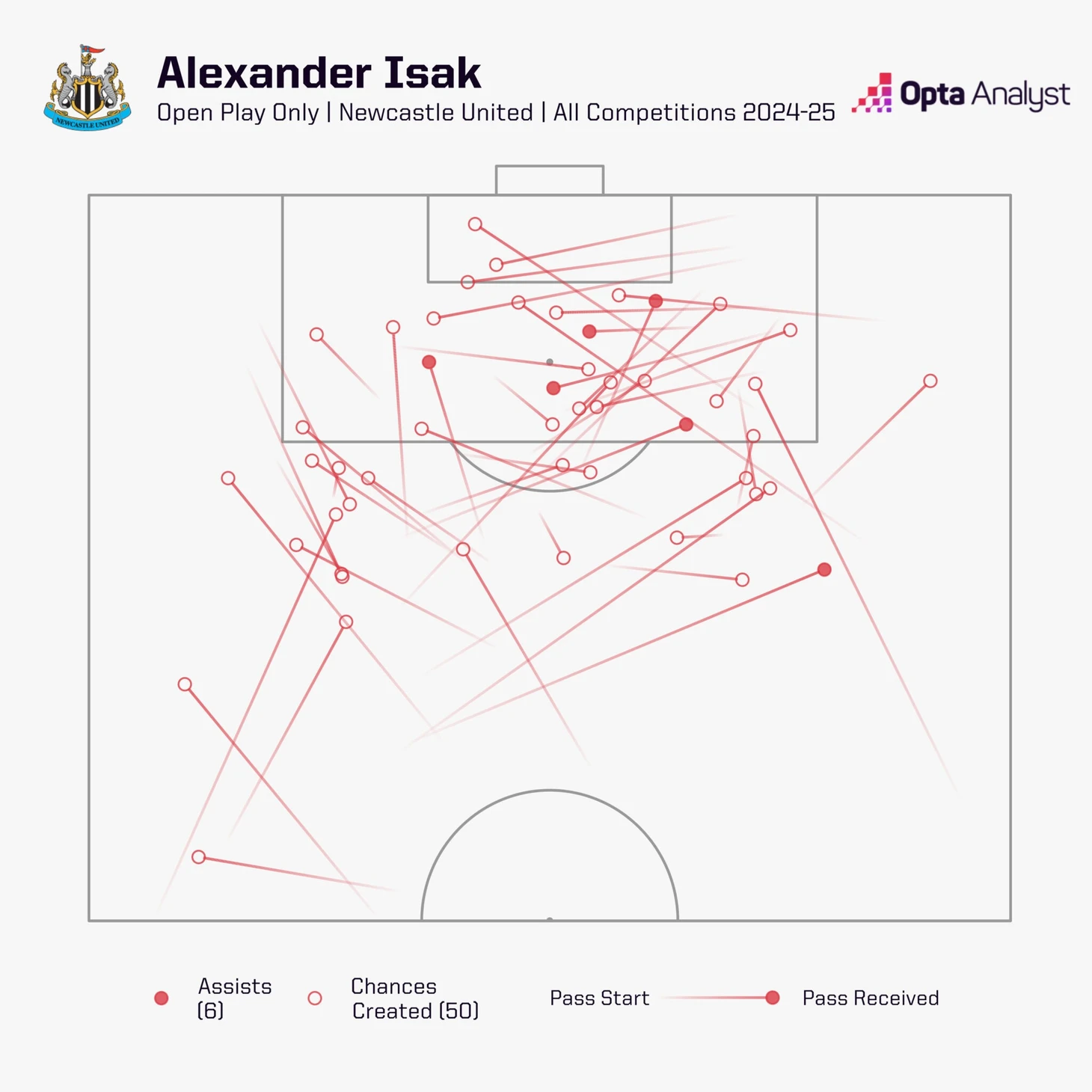 В сезоне 2023/24 только трое игроков «Ньюкасла» создали в Премьер-лиге больше моментов с игры, чем Исак (27), хотя он записал на свой счет лишь две голевые передачи. В прошлом сезоне также только трое его партнеров по команде опережали его по созданным моментам в игре, в то время как только Джейкоб Мерфи (12) отдал больше его шести результативных передач.
