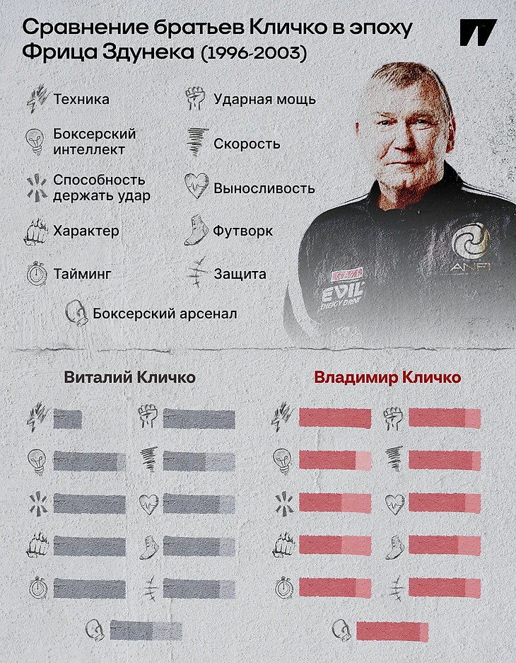 Вместе с тем у них немало различий. Владимир – более одаренный и техничный боксер. Он сохранил великолепную ударную технику со времен любительской карьеры и Олимпийских игр и перенес ее в профи. В эпоху Фрица Здунека (1996-2003) Владимир боксировал очень красиво: использовал в комбинациях не только прямые удары, но и чистые хуки с апперкотами.