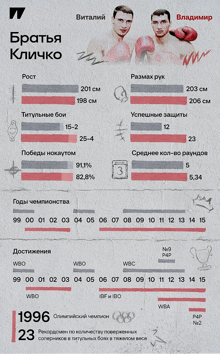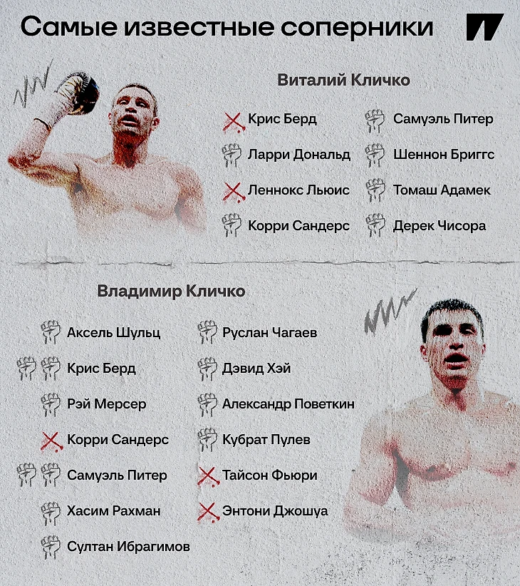 Виталий и Владимир Кличко – самые успешные тяжеловесы второй половины нулевых и первой половины 2010-х. Они поочередно мстили за поражения, никогда не встречались на ринге и отказались от спаррингов друг с другом во избежание травм.
