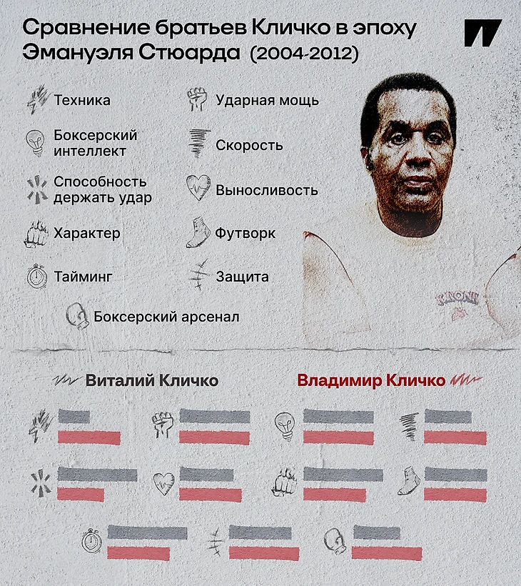 «Они – лучшие тяжеловесы со времен Олимпиады 1988 года. В последнее десятилетие в тяжелом весе было много американских бодибилдеров с огромными габаритами, но без контроля над телом и базовых навыков. Кличко – высоко координированные крупные парни с солидным любительским опытом. Они единственные, кто заставляют меня нервничать», – говорил Эмануэль Стюард в 2002-м, за год до боя Кличко – Льюис.