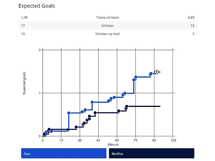 Если считать ожидаемые голы (xG), то первенство «Аякса» было очевидным. Амстердамцы давили хорошо организованных гостей, но те никак не сдавались. В свою очередь выпады португальцев заставляли амстердамскую оборону держать себя в тонусе.