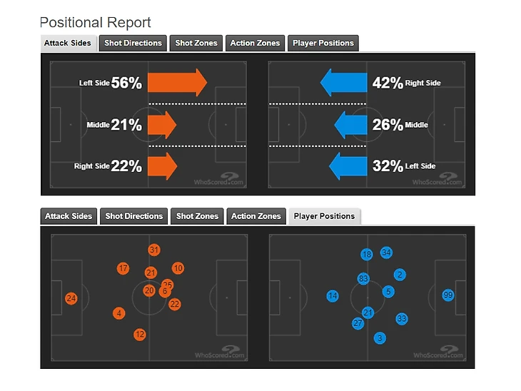 Хозяева имели преимущество по владению мячом на протяжении всего матча (57% на 43%). Территориально это привело к 30% активных действий на трети поля гостей и превосходству по ударам (17 на 13). Однако преимущество по точным выстрелам (10 на 3) несколько обманчиво. 7 из 10 ударов в створ наносилось из-за пределов штрафной.