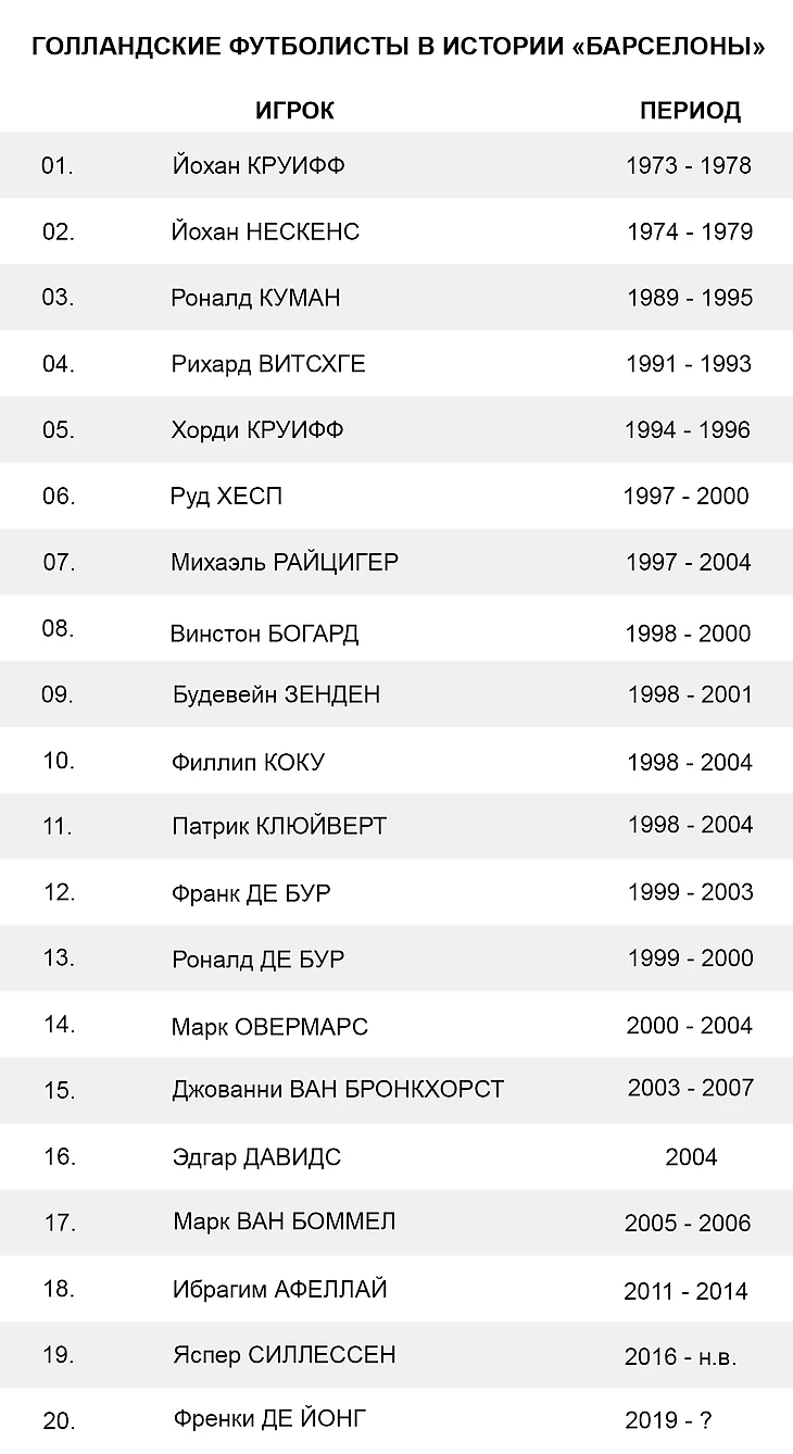 В таблице ниже не учитываются футболисты, которые так и не добрались до первой команды. Возможно, Данни Мюллер и Джеффри Хугерворст слишком рано покинули «Аякс» ради испанских приключений. На высоком уровне оба не заиграли. А вот у Хави Симонса все впереди. Пятнадцатилетний воспитанник «Ла Масии» наверняка скоро пробьется в основу главной команды Каталонии. Может быть, успеет сыграть и с Френки де Йонгом.