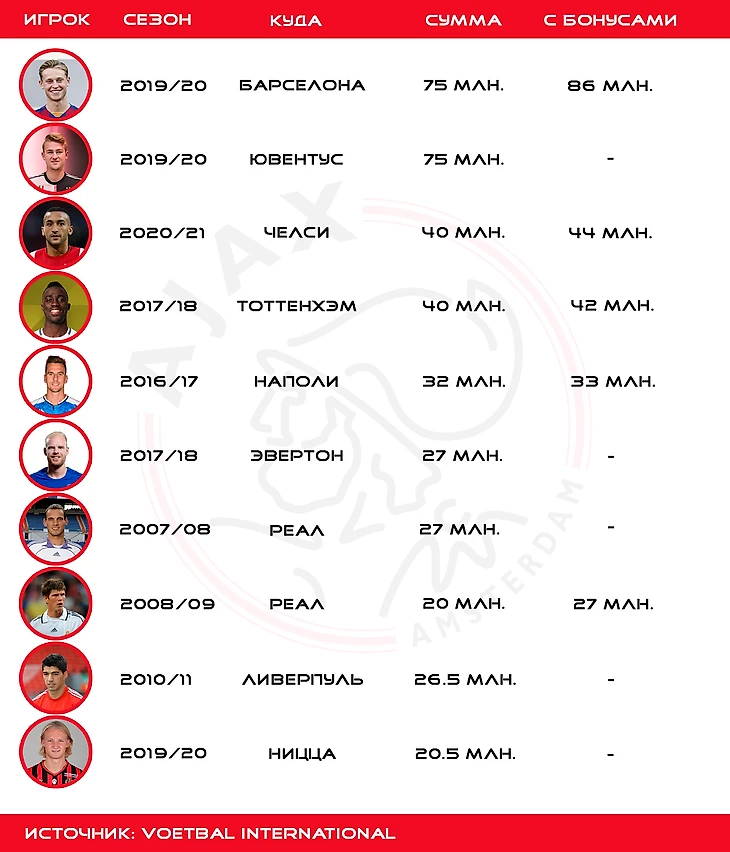 Но даже при такой «заниженной» стоимости в истории исходящих трансферов «Аякса» Хаким Зиеш может расположиться на третьей строчке. С учетом бонусной части марокканец опередит колумбийского защитника Давинсона Санчеса, который перешел в «Тоттенхэм» за 40 + 2 млн. евро.