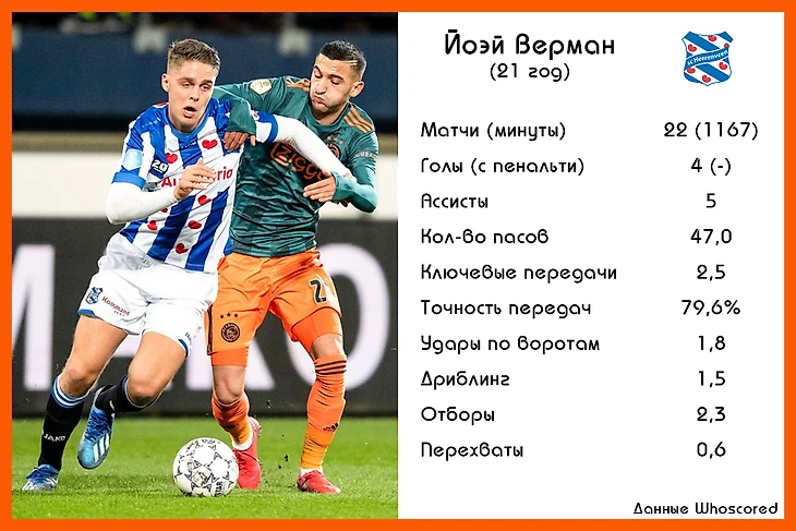 Его главная статистическая фишка – созданные моменты для партнеров, измеряемые «оптами» в ключевых передачах. По среднему показателю Верман до последнего времени входил в пятерку. Лишь в последних двух турах его опередил Стивен Бергхюйс. Но роттердамский атакующий полузащитник и играет выше, и «Фейеноорд» не чета «Херенвену».