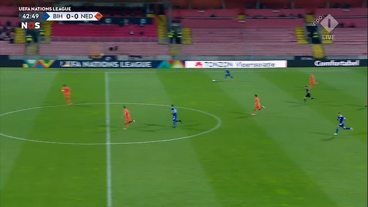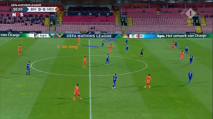 В Боснии Франк вновь изменил идею стартового состава, вернувшись к 4-2-3-1 с двумя опорниками – Френки де Йонгом и Мартеном де Роном. Это привычная структура для Голландии Кумана. Даже выбор мастера игры головой – Люка де Йонга был логичен (Депай отбывал дисквалификацию, а боснийцы играют компактно и обороняются низким блоком) и оправдал выбор Малена и Дюмфриса на правом фланге (клубные связки).