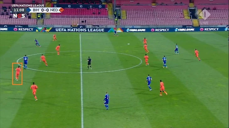 Опорник «Аталанты» силен в центре поля – он отбирает мячи и тормозит атаки соперника. Именно в таком качестве он играл и у Кумана. Но в матче против Боснии де Рон подозрительно часто опускался в линию защиты, располагаясь между де Вреем и Дюмфрисом. Вряд ли по собственному желанию. Видимо, играть третьего центрального защитника было все же заданием тренера. Попытка выстроить 5-4-1 при игре в обороне?