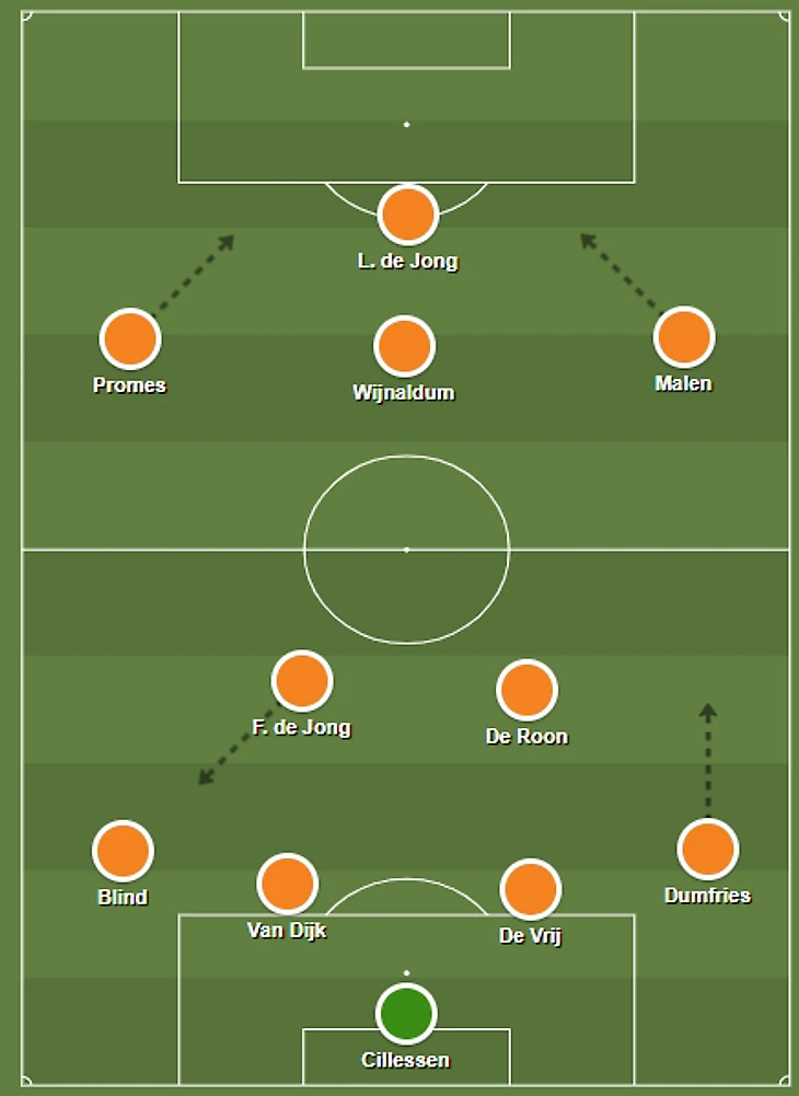 Фактически, идея игры в атаке сводилась к фланговым проходам защитников (Дюмфрис и Блинд), навесам на таргетмена (Люк де Йонг) и смещениям полувингеров Промеса и Малена в центр для создания дополнительных вариантов в штрафной или на подступах к ней.