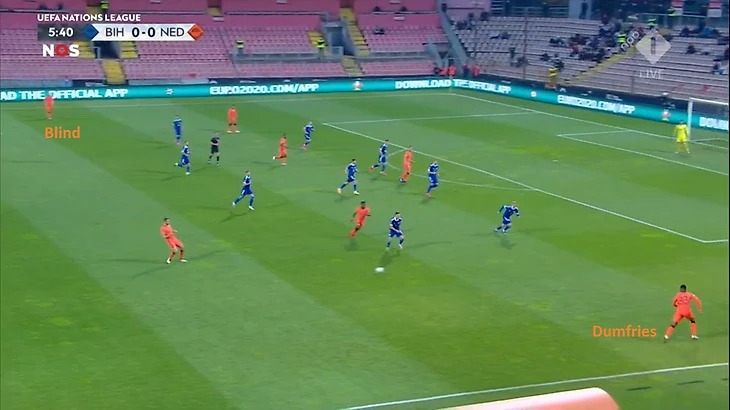 Блинд и Дюмфрис действительно много бегали, но не всегда успевали возвращаться. Обоих заменили во втором тайме (усталость?). Ситуация, когда Дейли с позиции левого вингера навешивает в штрафную, куда устремляется Дюмфрис, возможно, и таила потенциальную угрозу. Но фактически, создавало потенциальную опасную контратаку. Без должной подстраховки это выглядело слишком авантюрно.