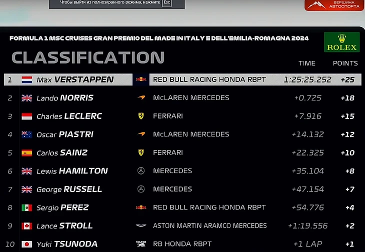 Четвертым черту пересек Пиастри, который на Hard'е уже был не так хорош, как в начале гонки, но не дал Сайнсу даже намека на борьбу за 4-ю строчку. Непростая гонка вышла у Mercedes. Хэмилтон повторил пятничные па в Acque Minerali, но в этот раз избежал разворота, ограничившись произвольным прокатом по гравию. 6-е место и 35 секунд проигрыша победителю - максимум для «Серебряных стрел» в Имоле. Расселл потренировал быстрые круги, отдав позицию Хэмилтону, но они оба опередили Переса, который при одном пит-стопе проиграл Джорджу с двумя. Серхио в очередной раз сослался на плохую стартовую позицию, из-за которой в гонке пришлось придумывать что-то новое. Только вот за рулем лучшей машины чемпионата сидит сам Перес, и только он сделал себе субботу неудачной.