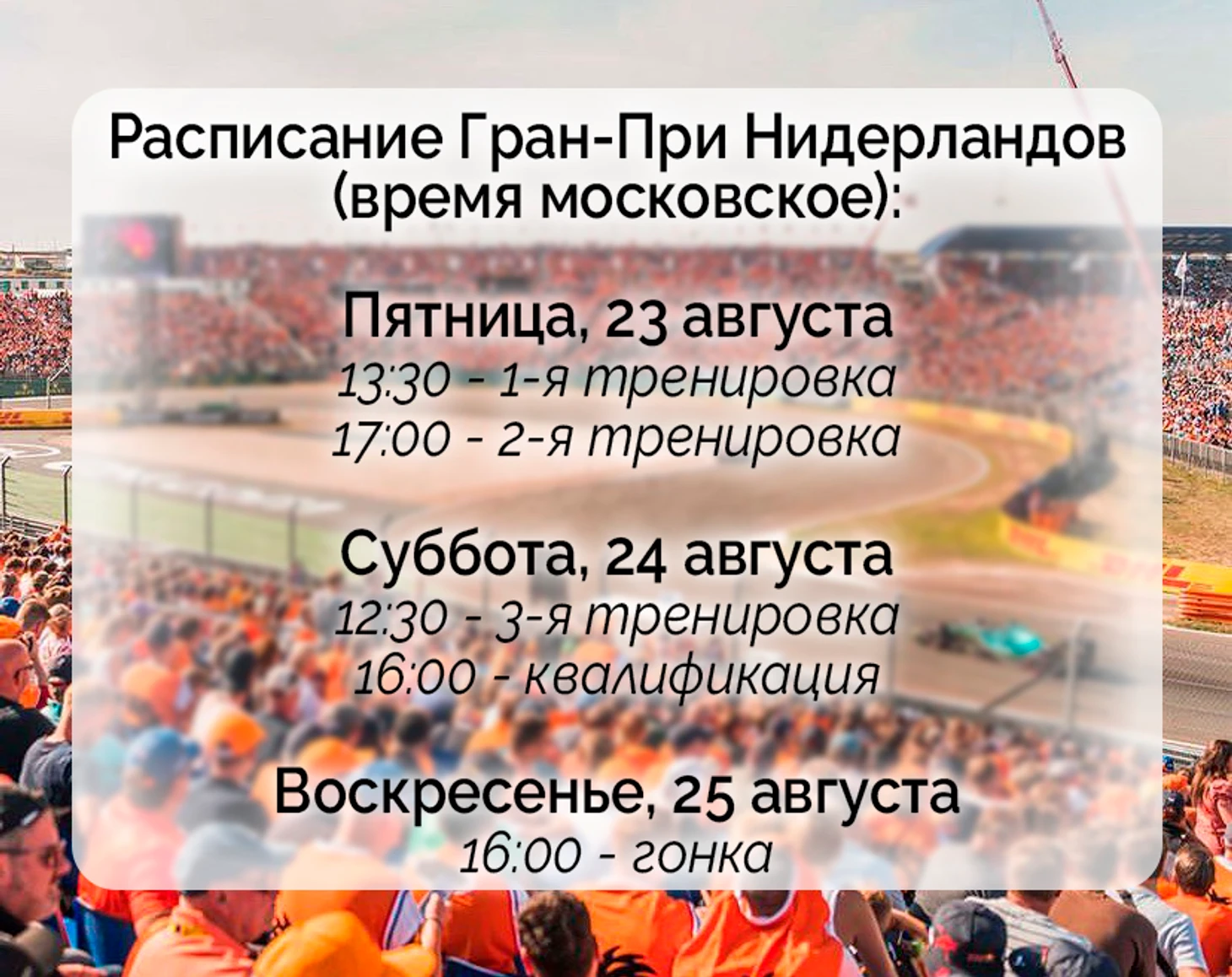 А тем временем синоптики пытаются угадать погоду на побережье Северного моря в конце лета. Пока ожидаются осадки в пятницу, похолодание в субботу и ветреное, но ясное воскресенье. После месяца ожиданий, да еще с непредсказуемым прогнозом, Гран-При Нидерландов обречен на зрительский успех. Подтвердит ли гонка все ожидания от первого уик-энда после каникул?