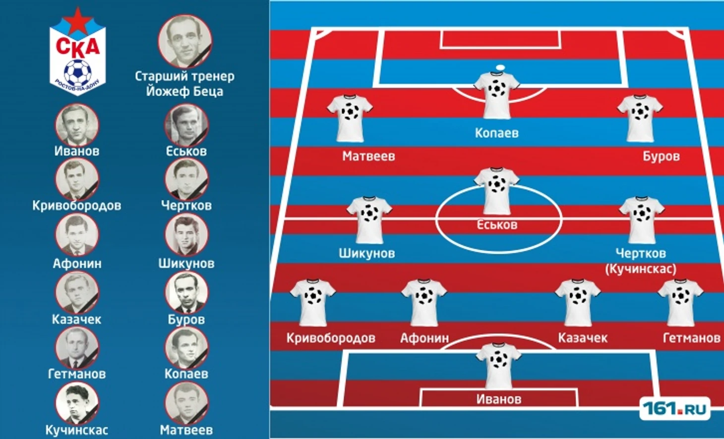 Вскоре после 4 места в 63 году, он уехал в Киев, возглавив «Динамо». Но легендарный тренер оставил плеяду ярких игроков в Ростове. Шикунов, Буров, Еськов, Казачек, Копаев, Иванов, Матвеев, Кривобородов.