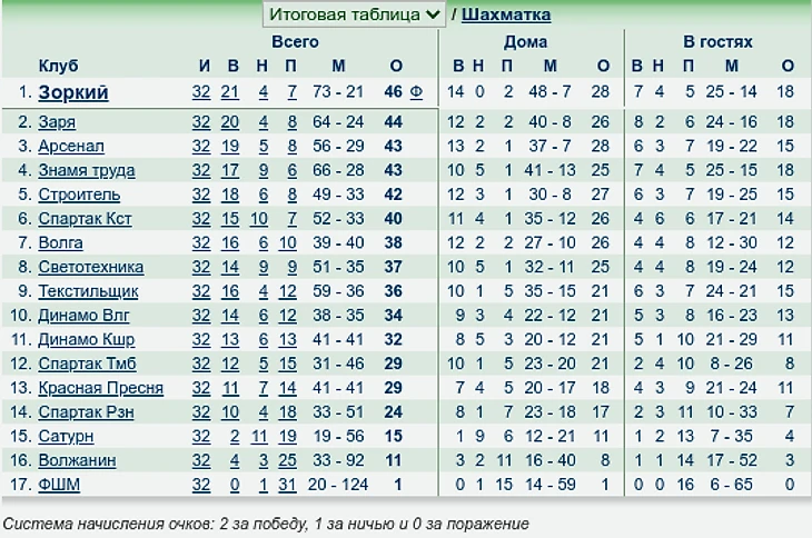 В целом "Зоркий" провел неплохой сезон, многие специалисты отмечали, что команда играла плавно, атлетично, тактически грамотно. Что и привело к 71 забитому мячу, всего 21 пропущенным голам. В графах победы-ничьи-поражения, следующие показатели: 21-4-7.