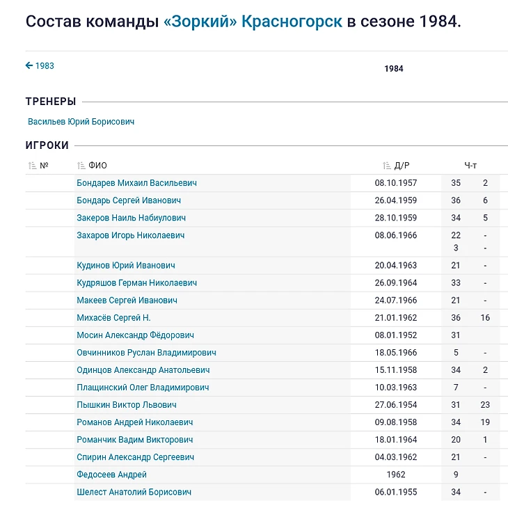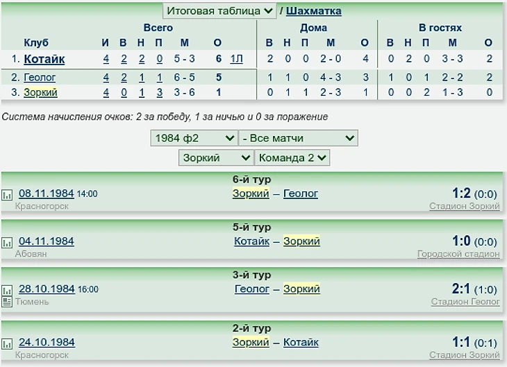 За годы выступления во второй лиге «Зоркий» покорил две вершины. И обе в лучшем для команды сезоне 1984 года. В чемпионате СССР красногорцы стали победителями зонального турнира. Обычно для такого успеха требуется немало лет, а недавний дебютант прошел этот путь за три года. В ноябре в Сочи «Зоркий» выиграл звание чемпиона РСФСР.