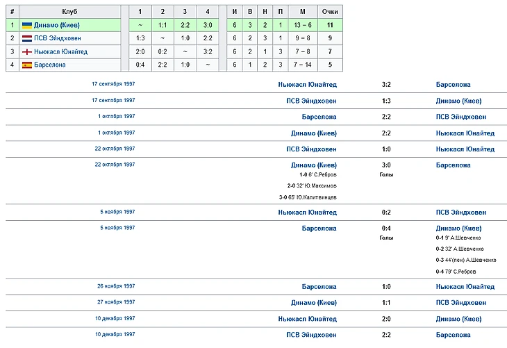 И вот что было: ПСВ повержен 3:1, ничья с «Ньюкаслом» 2:2, «Барселоной» — 3:0 в Киеве и 4:0 на «Камп Ноу», с хет-триком Андрея Шевченко. Затем ничья с ПСВ, что обеспечило досрочное первое место в группе.