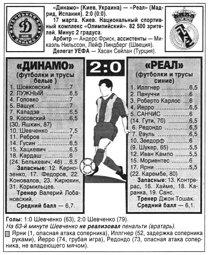 Четвертьфинал динамовцам принес в соперники действующего обладателя Лиги Чемпионов - мадридский «Реал» в составе которого были Иллгнер, Роберто Карлос, Йерро, Рауль, Зеедорф, Шукер, Кампо, Морьентес. В Мадриде 1:1, а вот дома «Динамо» при 82 тысячах зрителей, добилось победы 2:0, стоит отметить, что все три мяча в противостоянии забил Андрей Шевченко.