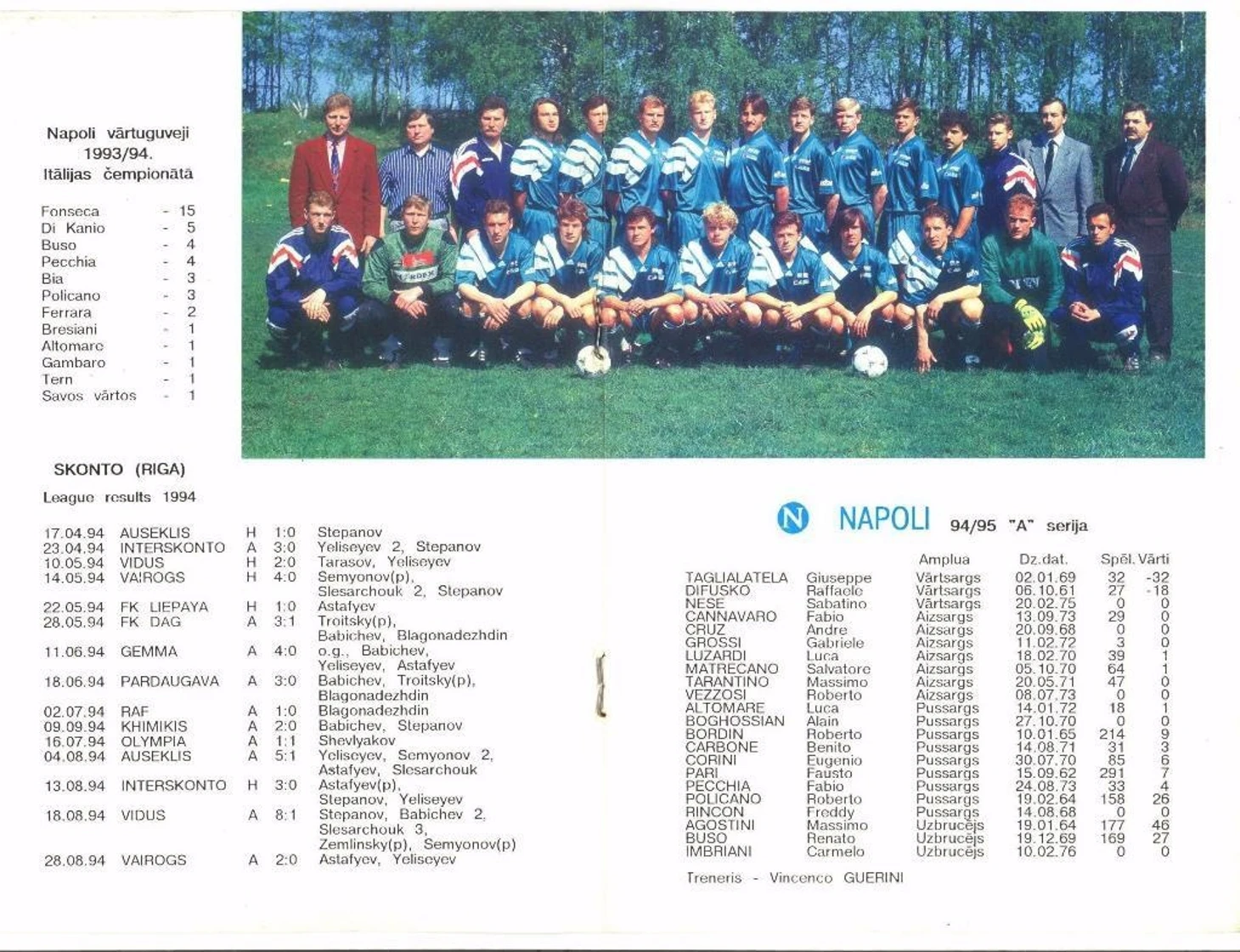 Становясь чемпионом Латвии, «Сконто» постоянно участвовал в еврокубках, где временами выдавал очень серьезные результаты. К примеру победа по сумме двух встреч над шотландским клубом «Абердин» (0:0, 1:1) в предварительном раунде розыгрыша Кубка УЕФА, в августе 1994-го года. В следующем раунде клуб сыграл с итальянским «Наполи» (0:2, 0:1).