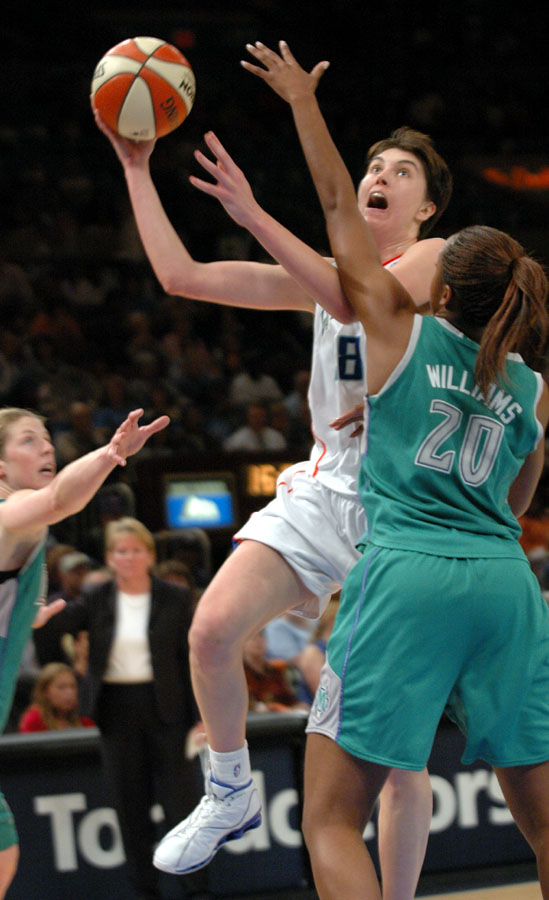 Летом 2004 года Елена Баранова, ставшая окончательно свободной спортсменкой, вновь отправилась в НБА. Но на этот раз уже в новый клуб – «Нью-Йорк Либерти». (где, к слову, уже начал ярко распускаться такой «цветок», как Бэкки Хэммон) И именно в этом неплохом клубе, можно сказать, случился весьма необычный опыт игры у российской баскетболистки. Ряд матчей команда провела на... театральной сцене! Дело в том, что знаменитый «Мэдисон Сквер Гарден» должны были переделать под съезд Республиканской партии перед грядущими выборами. Работа должна была продлиться весьма долгое время. Так и что? Решено было тогда отправить команду играть.... в «Радио-Сити-Мьюзик-Холл». Самая большая театральная сцена Америки стала ... ареной для женской баскетбольной команды!