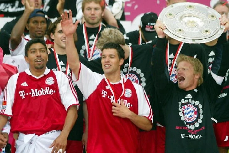 Футболисты «Баварии» Джоване Элбер, Михаэль Баллак и Оливер Кан празднуют победу в Бундеслиге сезона 2002/03