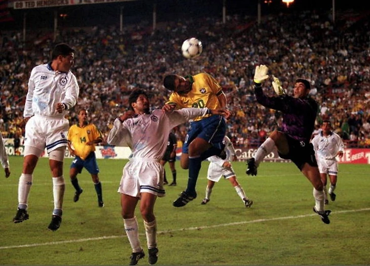 Элбер в дебютной игре в составе сборной Бразилии отправляет мяч в ворота Гватемалы (1:1)