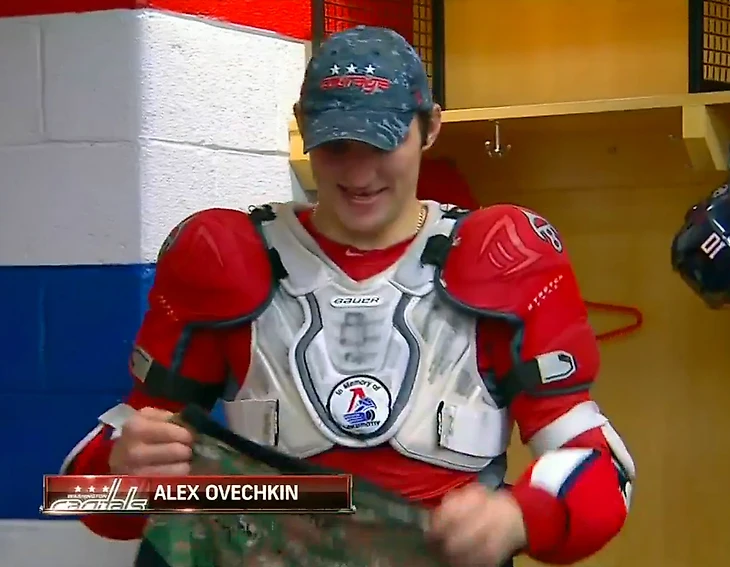 Овечкин не первый раз играл в таком нагруднике – еще в феврале 2014 года журналисты заметили эту нашивку на амуниции Александра.