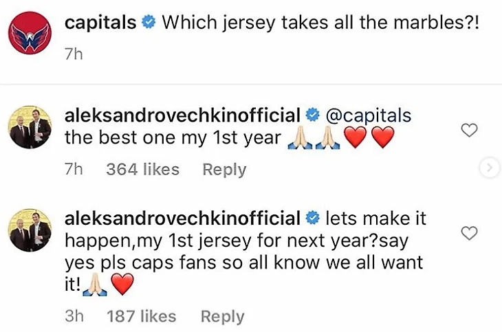 Еще до начала массовых беспорядков в США «Вашингтон» запустил в своих соцсетях голосование – фанатам предложили выбрать лучшую игровую форму в истории клуба. Победу одержал свитер, в котором «Вашингтон» участвовал в мачте Зимней классики-2015, но в комментариях отметился и главный человек в истории клуба. Овечкин предложил свой вариант – свитер, в котором он дебютировал в НХЛ.