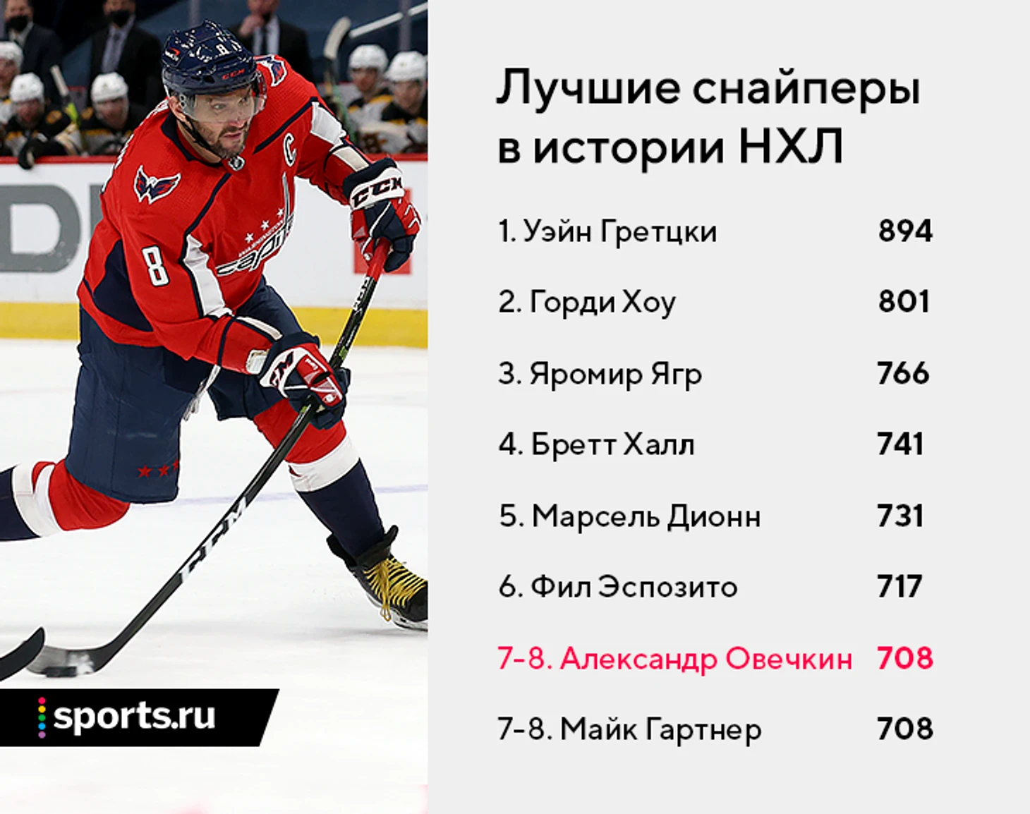 Сейчас Овечкин делит в списке снайперов седьмое место с Гартнером. Ближайшая цель – великий Фил Эспозито, до которого всего лишь 9 шайб.