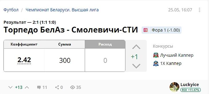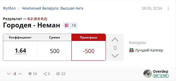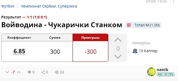 Результат с учетом ставок капперов: -800 рублей (ROI -72,72)
