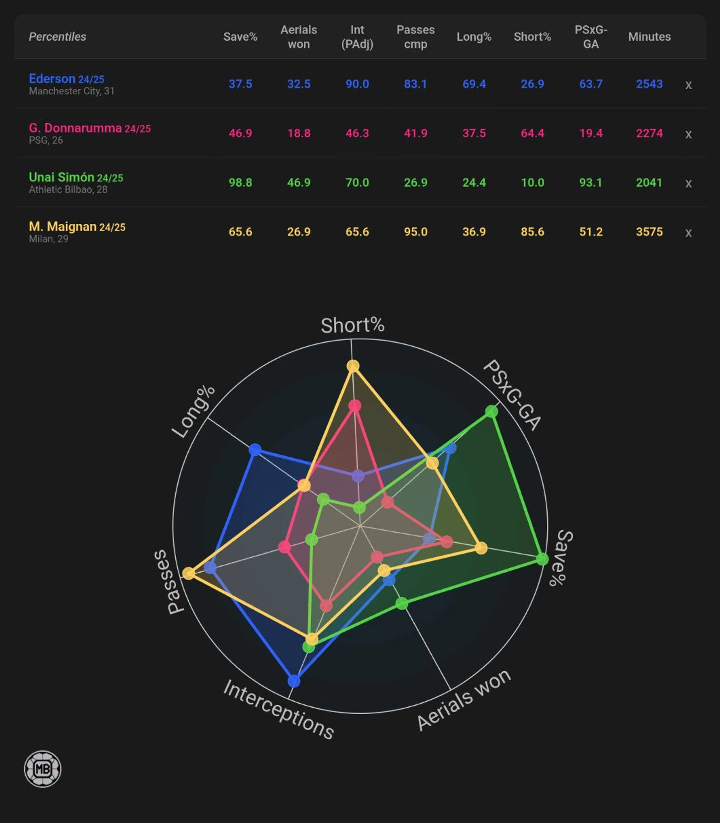 Для команды высокого уровня очень важен вратарь, умеющий отдать точный длинный пас. Это качество на реально элитном уровне тут только у Эдерсона. В то же время, Меньян известен своей игрой ногами — хорош в лонгболлах, но всё равно отстаёт от бразильца сильно. Симон и Доннарумма же слабоваты, испанец особенно.