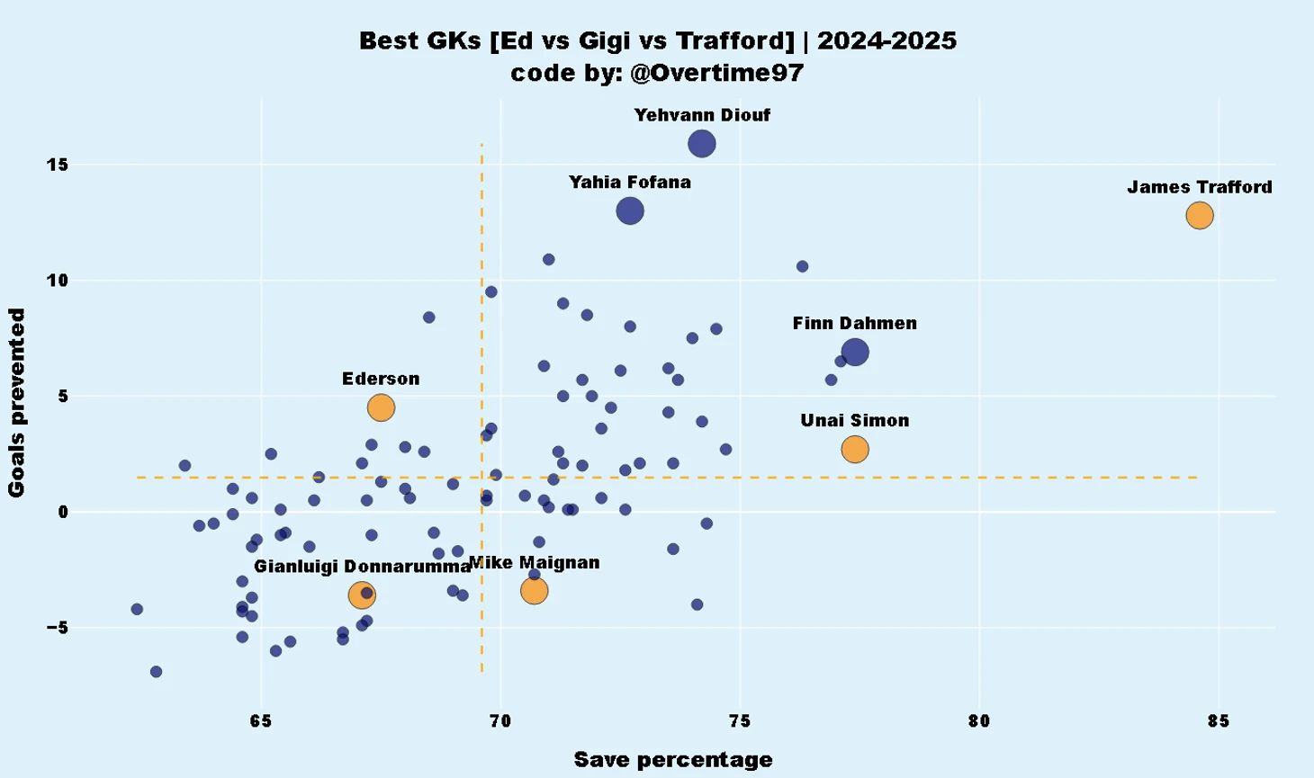 Что мы имеем. Итальянец далеко не так крут в шотстоппинге на дистанции, по крайней мере в прошлом сезоне. Он также очень ограничен в игре ногами, что было особенно заметно в больших матчах. Из других вариантов был неплохой Симон и хороший на мяче Меньян. Джиджи моложе, но уже имеет больше опыта на элитном уровне. При всём этом, Эдерсон, учитывая глубокую статистику, не заслуживает столько критики.