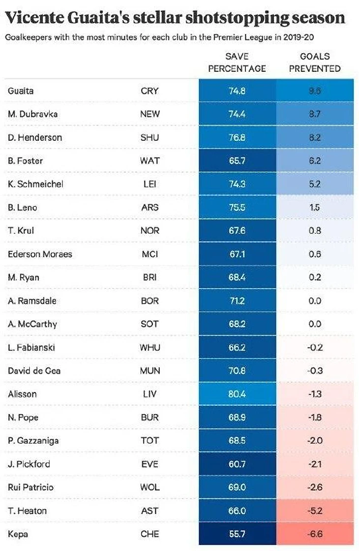 • В Премьер-лиге есть 5 крутых вратарей по предотвращенным голам, но 3 из них – элита. Гуаита – лучший по этому показателю. Его «Кристал Пэлас» идет в середине таблице и имеет 12-и очковый запас над зоной вылета. Но если бы испанец не феерил в этом сезоне, то, наверное, КП барахтался в зоне вылета.