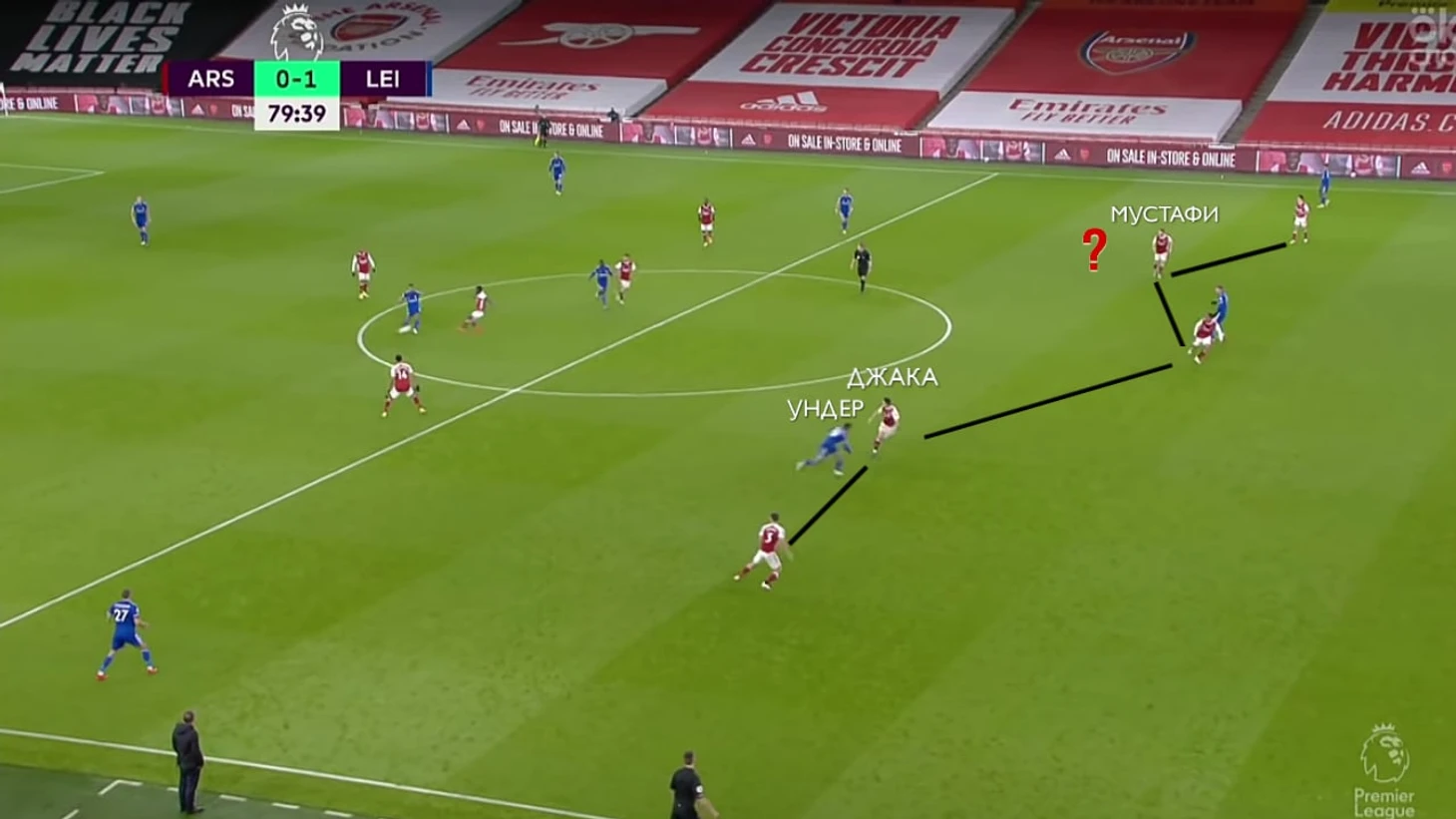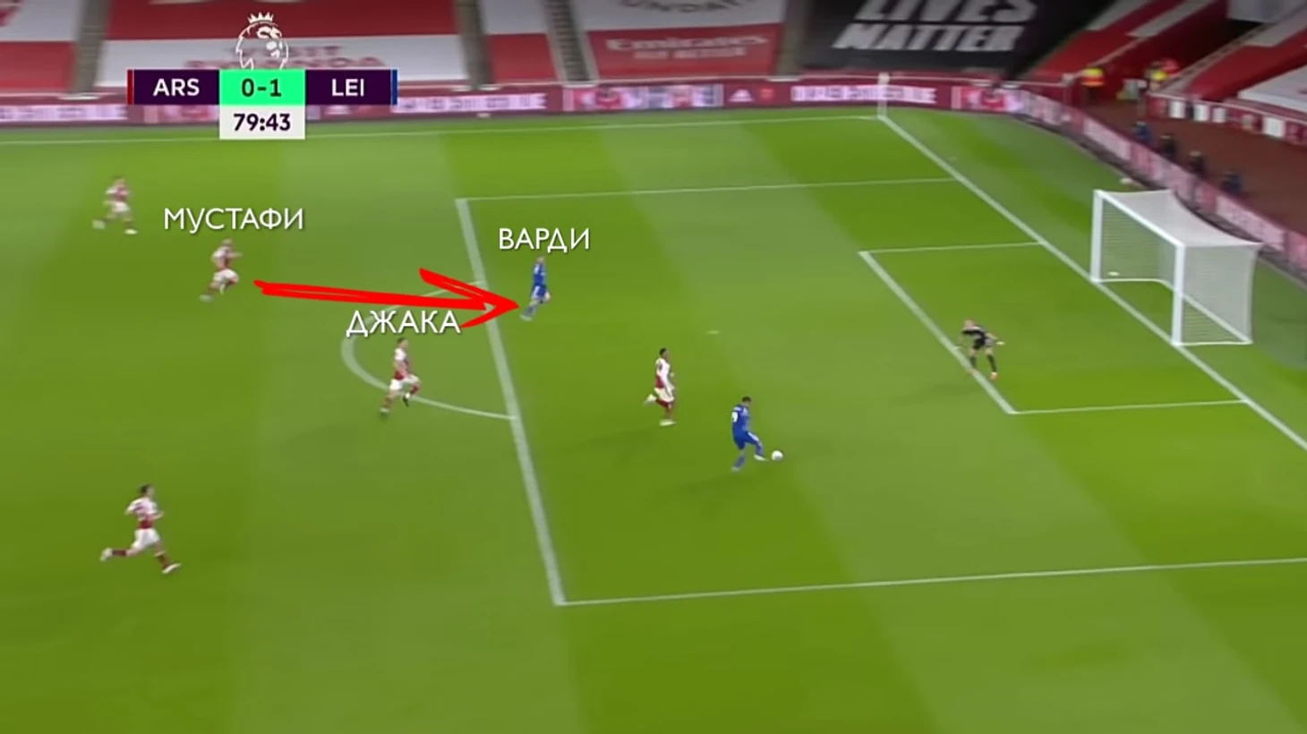 Идёт длинная передача от Тилеманса, более быстрый Ундер убегает от Джаки, Габриэл выдвигается на турка и оставляет одного Варди. В данном случаем бразилец делает всё правильно, другое дело – кто-то должен был переключиться на Варди. Джака изначально проиграл позицию (он не успеет даже при всех стараниях), единственным верным и спасительным вариантов был Мустафи, но он либо не понимает игру, либо просто не хочет бежать.