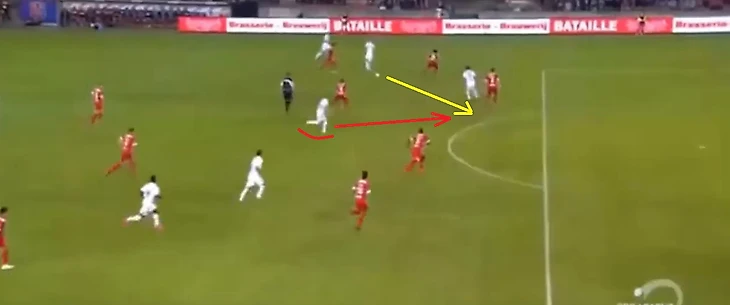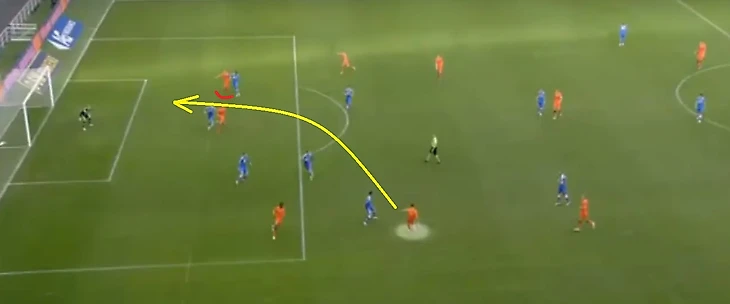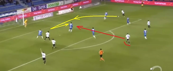 И все же особняком стоит другое качество капитана «черно-синих» – умение здорово открываться. Вормер – из того числа игроков, которые берут свое пониманием игры, а не беготней в стиле реактивного самолета. Обратите внимание: большинству голов голландца с игры предшествовало грамотное открывание. Он читает игру почти так же феноменально, как и Шерлок Холмс видит картину преступления. Чаще всего Руд либо открывается на дальней штанге, либо врывается в центр штрафной из глубины. Этот навык, развитый почти до степени инстинкта, делает хавбека «Брюгге» самым тонким игроком всей Лиги Жюпиле. Примеры открываний Руда – на слайдах ниже (красным цветом выделены движения Руда Вормера, желтым – движение мяча).