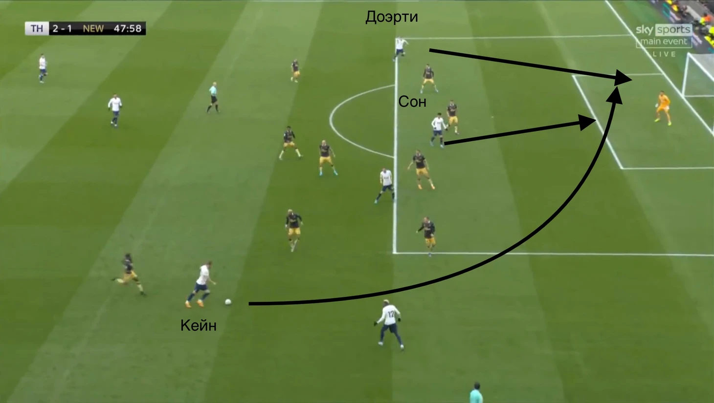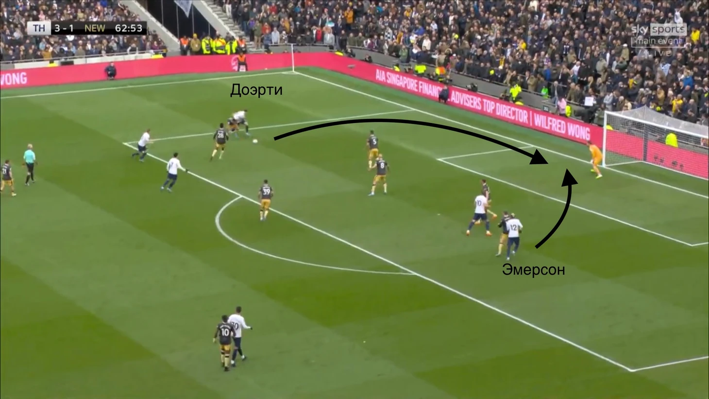 На 53 минуте после очередной атаки в исполнении «шпор», проведённой через заброс и забег, Сон наконец-то забил. Ему удалось сделать 2 касания в штрафной, что показывает насколько плохо его закрыли защитники. На 65 минуте забил Эмерсон. Бразилец прошёл из одного угла штрафной до другой и замкнул навес Мэтта. Вот как развивалась эта атака: