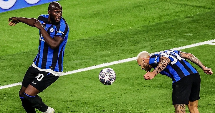 Интер побежал вперёд и начал создавать опасные моменты. Первым таким моментом стала неразбериха в штрафной Сити после подачи. Сначала Димарко пробил в перекладину, затем пробил на добивании и попал в Лукаку, не заработав даже углового.